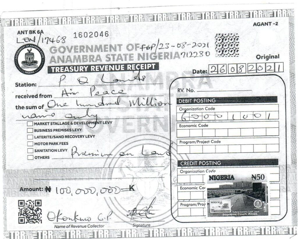 The payment of ₦100 million was made directly to the Anambra State Government for the MRO land. The payment for the MRO land was officially acknowledged with a government-issued receipt confirming full settlement for the designated parcel. The company also noted that this documentation remains verifiable and transparent for public scrutiny.